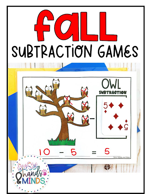 These fall subtraction games are LOW PREP (only one page) and engaging! Grab your favorite themed manipulatives and PLAY. Each game also comes with a recording page.